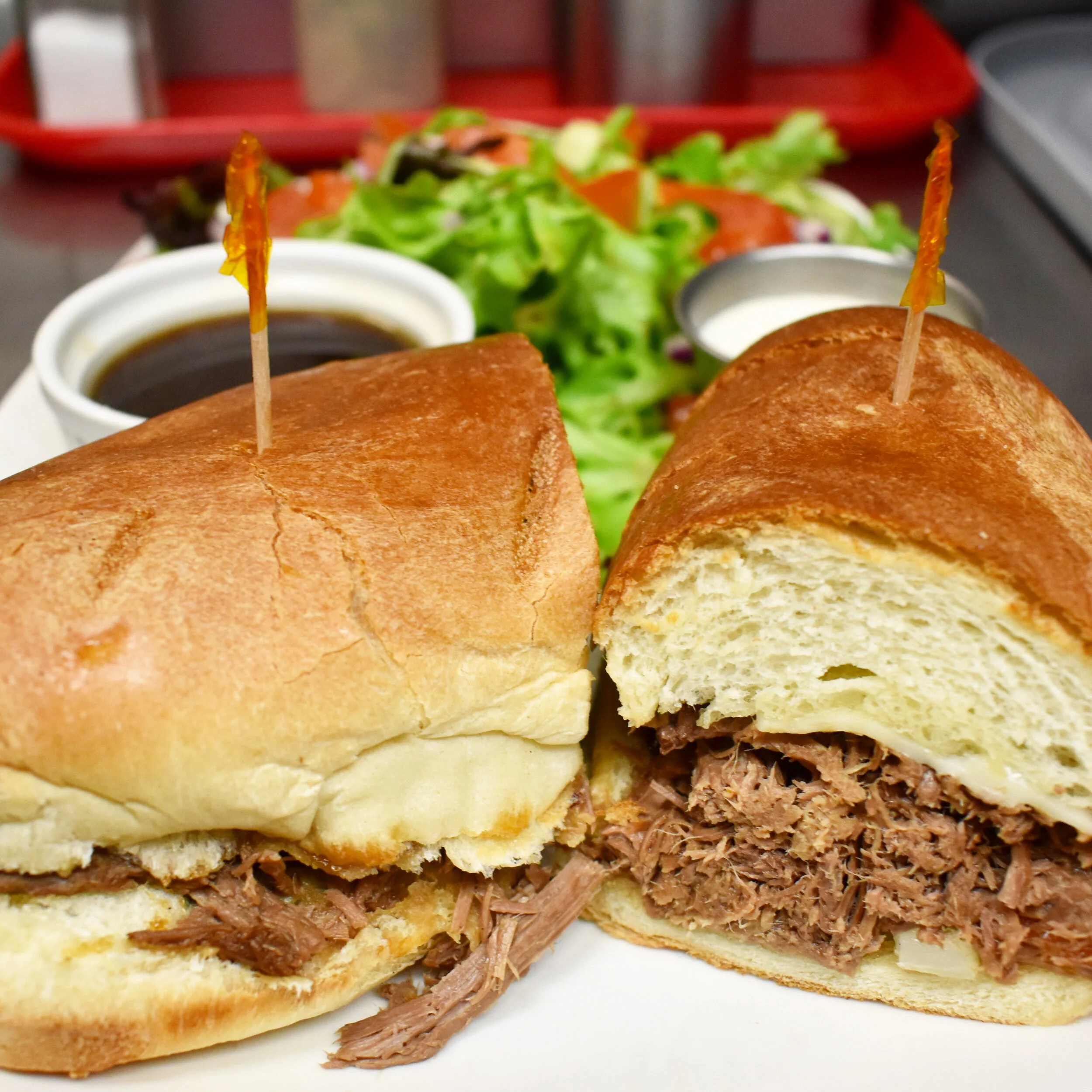Thinly sliced slow roasted beef, sautéed onions and peppers, swiss, horseradish mayo on toasted baguette.
